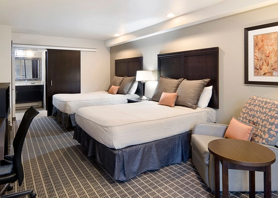 Our goal is rest and relaxation. Our rooms are warm and cozy, offering either two extra-long queen beds or one king-size bed. If you're traveling for business, we offer an executive room with one queen-size bed, extra work space, and a sofa. We also offer wheelchair accessible rooms, which have a choice of a roll-in shower or a tub shower with one king-size bed.